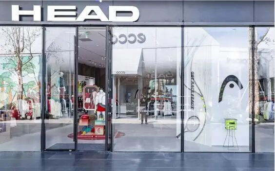 门头采用白色粗体HEAD无衬线LOGO+深灰哑光底板,对比强烈,远距离辨识度拉满,玻璃内侧印制品牌网球拍线条,强化运动专业属性。